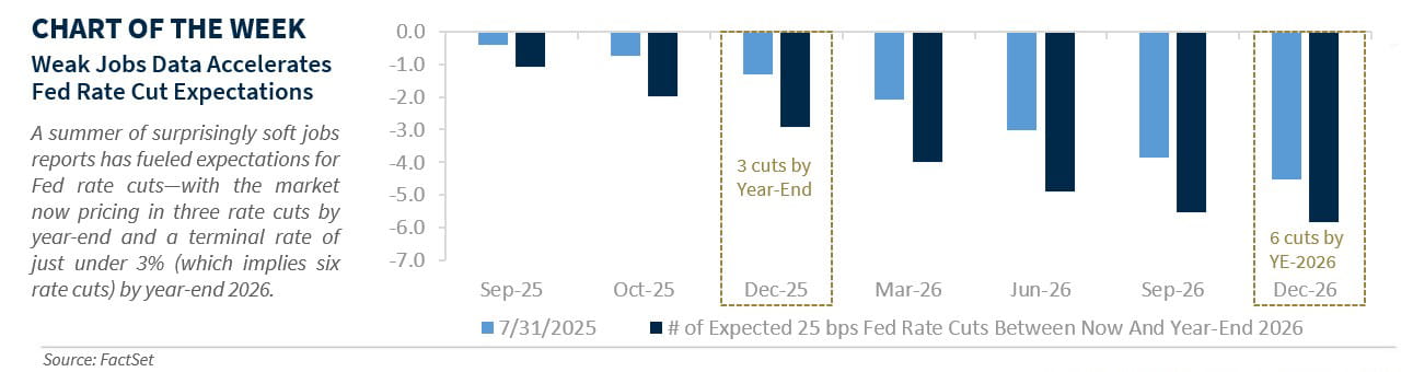 • A Fed Rate Cut Next Week Is A Near Certainty | Signs of weakness in the job market have started to emerge, leading Chair Powell to hint at possible rate cuts during his Jackson Hole speech in late August. Recent data has reinforced those concerns. Still, the Fed faces a balancing act—addressing those labor concerns while keeping an eye on a potential short-term bump in inflation.